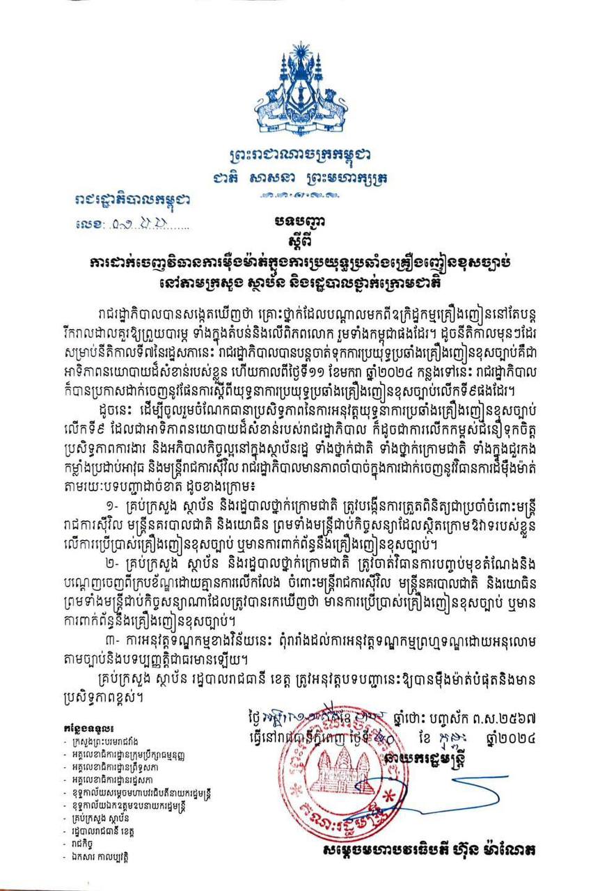 • បទបញ្ជា រាជរដ្ឋាភិបាលកម្ពុជា ស្តីពី “ការដាក់ចេញវិធានការម៉ឺងម៉ាត់ក្នុងការប្រយុទ្ធប្រឆាំងគ្រឿងញៀនខុសច្បាប់ នៅតាមក្រសួង ស្ថាប័ន និងរដ្ឋបាលថ្នាក់ក្រោមជាតិ”