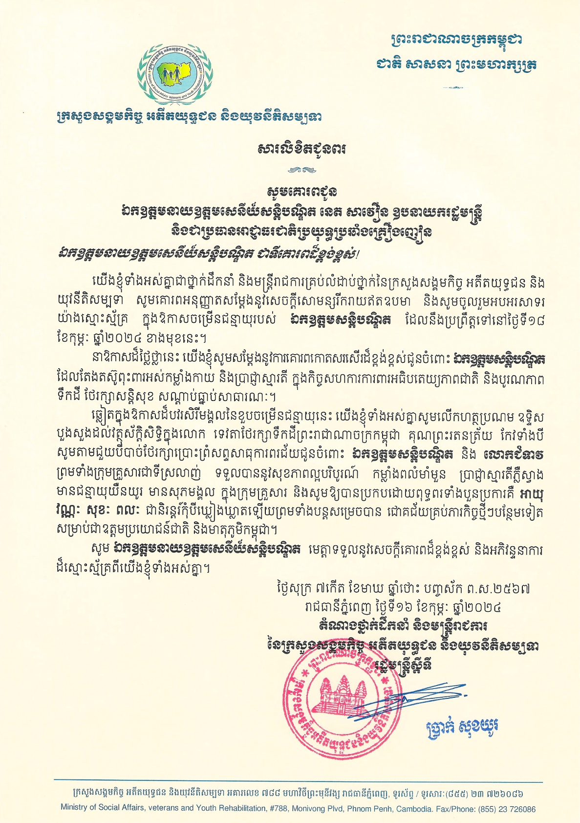 • សារលិខិតជូនពររបស់ក្រសួងសង្គមកិច្ច អតីតយុទ្ធជន និងយុវនីតិសម្បទា ជូនចំពោះ ឯកឧត្តមនាយឧត្តមសេនីយ៍សន្តិបណ្ឌិត នេត សាវឿន ឧបនាយករដ្ឋមន្រ្តី និងជាប្រធានអាជ្ញាធរជាតិប្រយុទ្ធប្រឆាំងគ្រឿងញៀន ក្នុងឱកាសចម្រើនជន្មាយុ