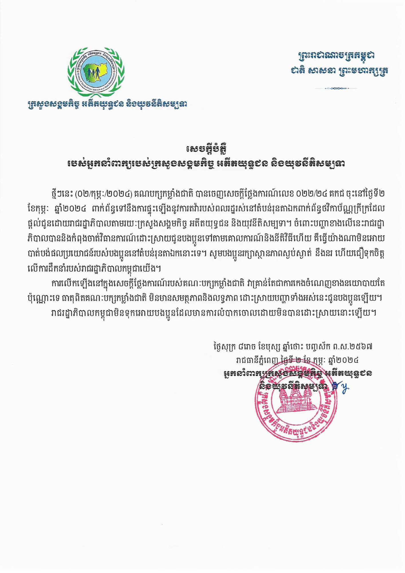 • សេចក្តីប្រកាសព័ត៌មានស្តីពីសន្និបាតបូកសរុបលទ្ធផលការងារឆ្នាំ២០២៣ និងលើកទិសដៅការងារឆ្នាំ២០២៤របស់ក្រសួងសង្គមកិច្ខ អតីតយុទ្ធជន និងយុវនីតិសម្បទា ដែលនិងប្រព្រឹត្តិទៅនៅថ្ងៃទី៥ -៦ ខែកុម្ភៈ ឆ្នាំ២០២៤ នៅទីស្តីការក្រសួង។