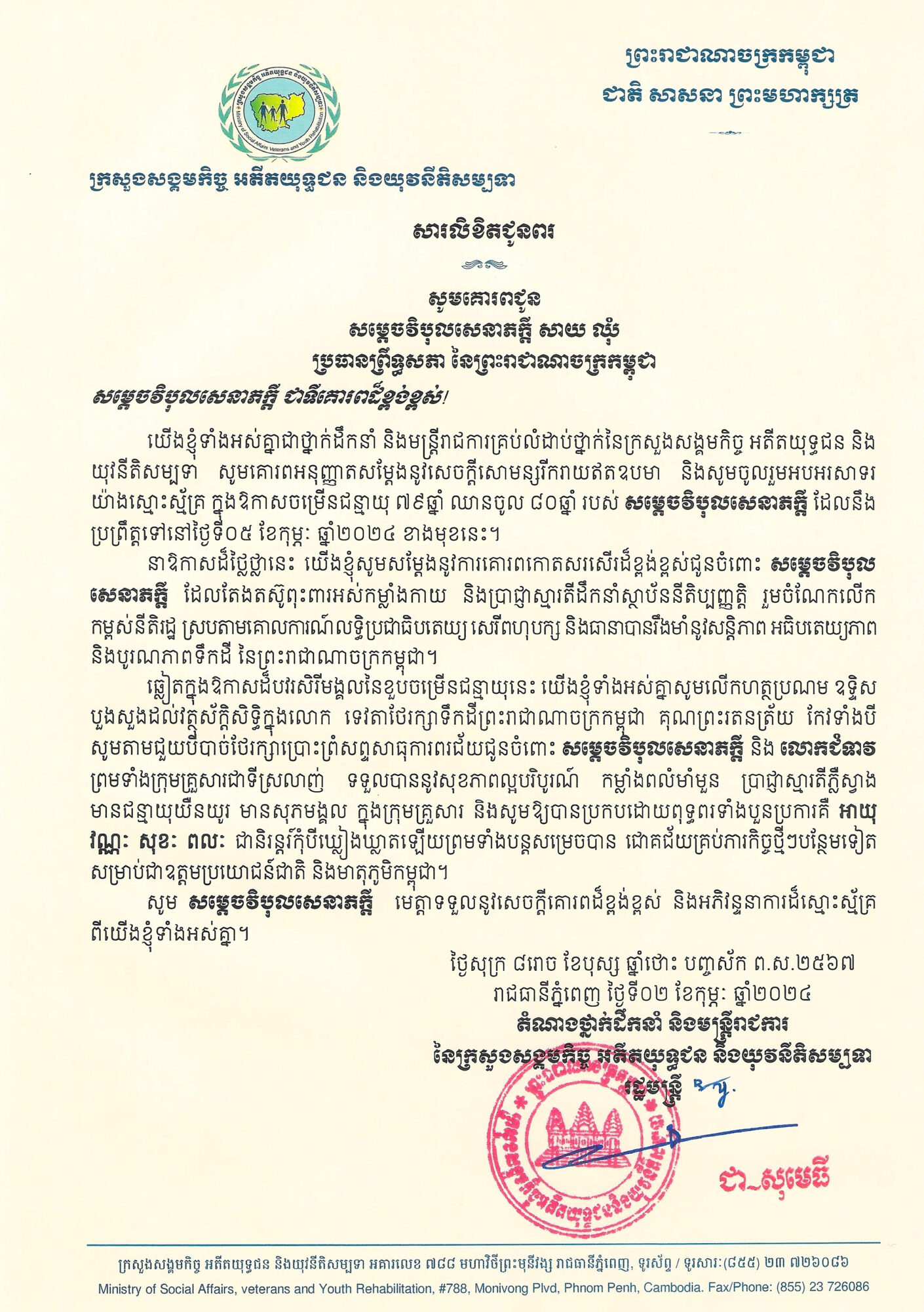 • ឯកឧត្តម ជា សុមេធី រដ្ឋមន្ត្រីក្រសួងសង្គមកិច្ច អតីតយុទ្ធជននិងយុវនីតិសម្បទា និងលោកជំទាវ ជា ផល្គុន គោរពជូនពរ សម្ដេចវិបុលសេនាភក្ដី សាយ ឈុំ ប្រធានព្រឹទ្ធសភា នៃព្រះរាជាណាចក្រកម្ពុជា ក្នុងឱកាសចម្រើនជន្មាយុ ៧៩ឆ្នាំ ឈានចូល ៨០ឆ្នាំ ។