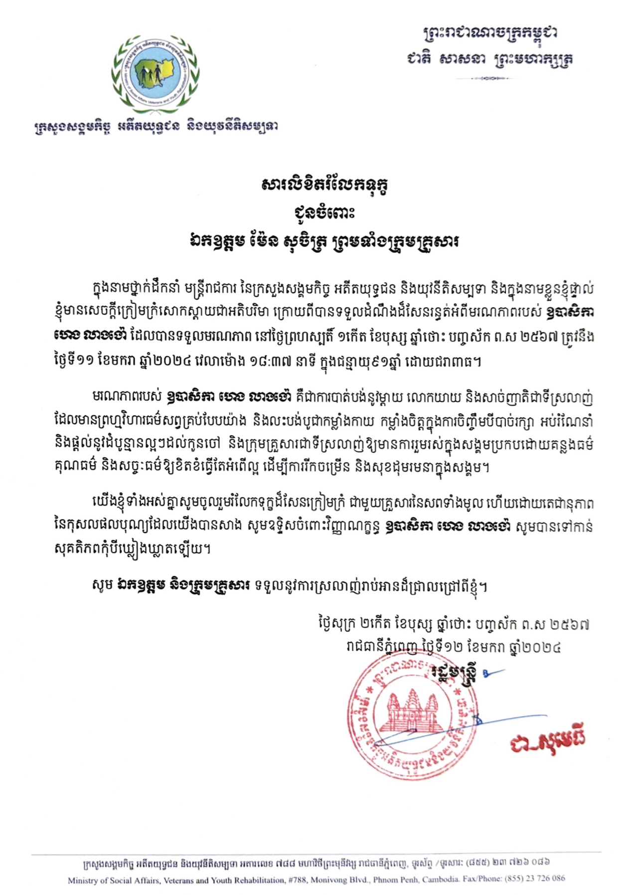 • ឯកឧត្តម ជា សុមេធី រដ្ឋមន្ត្រី ក្រសួង ស.អ.យ និងថ្នាក់ដឹកនាំក្រសួង ស.អ.យ. បានចូលរួមពិធីគោរពវិញ្ញាណក្ខន្ធសពឧបាសិកា ហេង លាងង៉ោ ត្រូវជាមាតាបង្កើតរបស់ឯកឧត្ដម ម៉ែន សុចិត្រ រដ្ឋលេខាធិការ ក្រសួង ស.អ.យ. ដែលបានទទួលអនិច្ចកម្ម ដោយជរាពាធ
