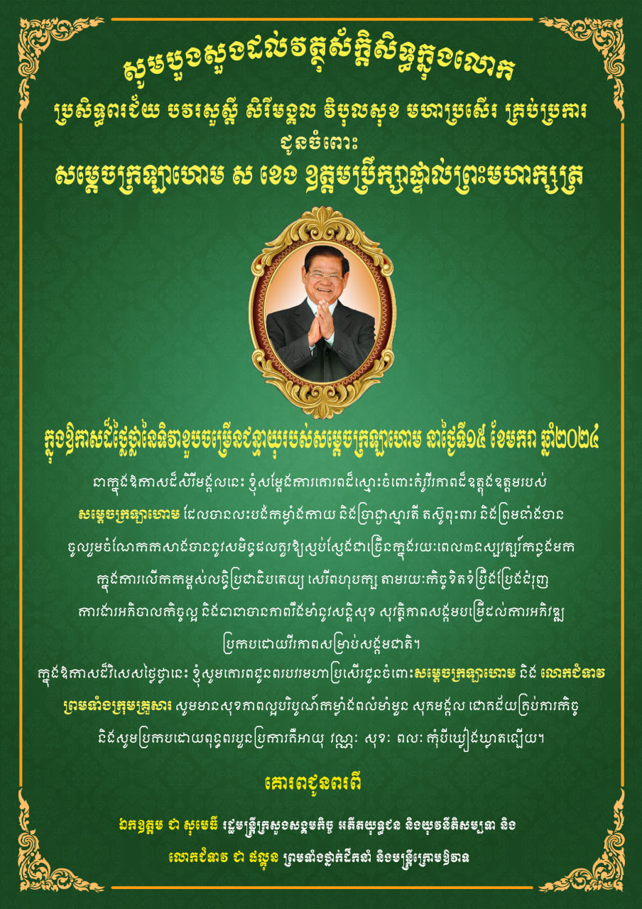 • ឯកឧត្តម ជា សុមេធី រដ្ឋមន្ត្រីក្រសួងសង្គមកិច្ច អតីតយុទ្ធជននិងយុវនីតិសម្បទា និងលោកជំទាវ ជា ផល្គុន គោរពជូនពរ សម្តេចក្រឡាហោម ស ខេង ឧត្តមប្រឹក្សាផ្ទាល់ព្រះមហាក្សត្រក្នុងឱកាសចម្រើនជន្មាយុ ៧២ឆ្នាំ ឈានចូល ៧៣ឆ្នាំ ។