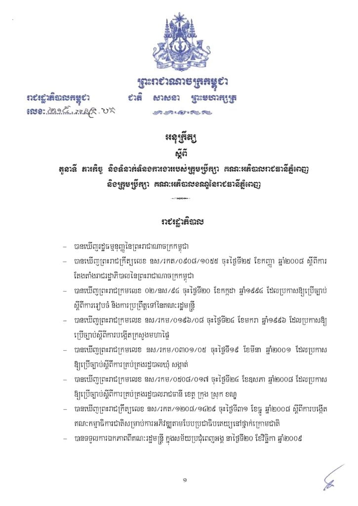 • អនុក្រឹត្យ ស្តីពី តួនាទី ភារកិច្ច និងទំនាក់ទំនងការងាររបស់ក្រុមប្រឹក្សា គណៈអភិបាលរាជធានីភ្នំពេញ និងក្រុមប្រឹក្សា គណៈអភិបាលខណ្ឌនៃរាជធានីភ្នំពេញ