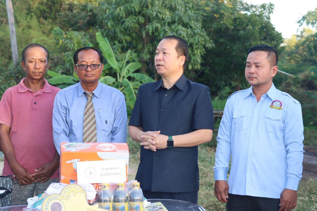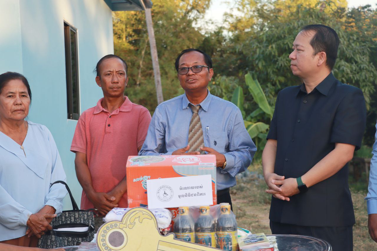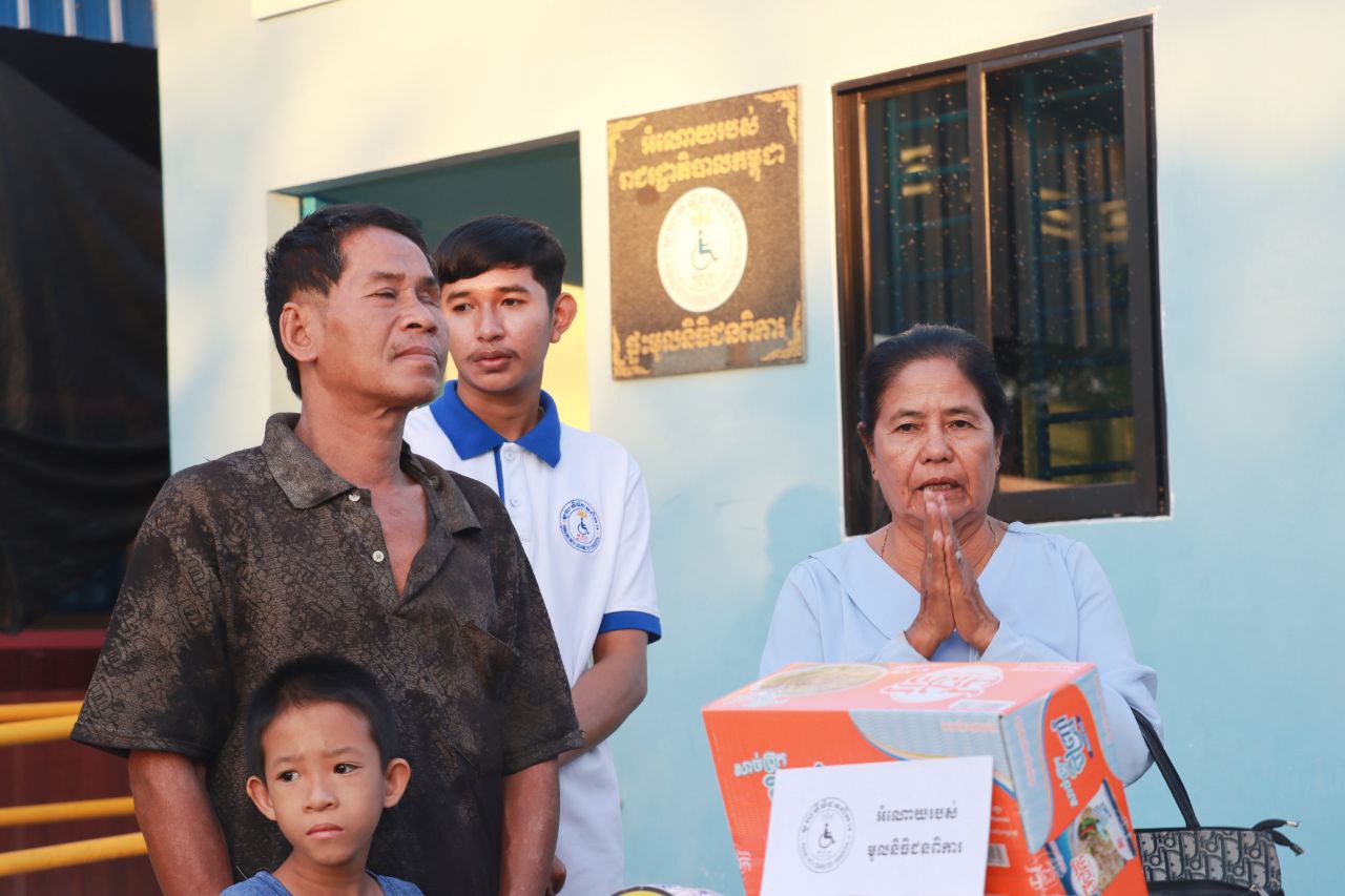 As part of the ceremony, the PWDs Foundation presented a gift package containing 25 kg of rice, 1 box of instant noodles, 1 package of fish sauce, 1 package of soy sauce, 2 packages of canned fish, 2 bags of salt, and 100,000 KHR to support the family in their daily life.