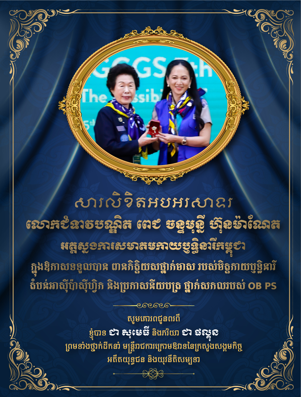 It is worth mentioning that the Asia-Pacific WAGGGS bestowed the Gold Award and OB-PS Global Certificate upon Her Excellency Pich Chanmony Hun Manet, the General Commissioner of the Girl Guides Association of Cambodia. This honor was conferred during the 7th General Assembly of the Friends of Asia Pacific WAGGGS, which took place on a Sunday morning in November 2023 in Siem Reap, Cambodia.