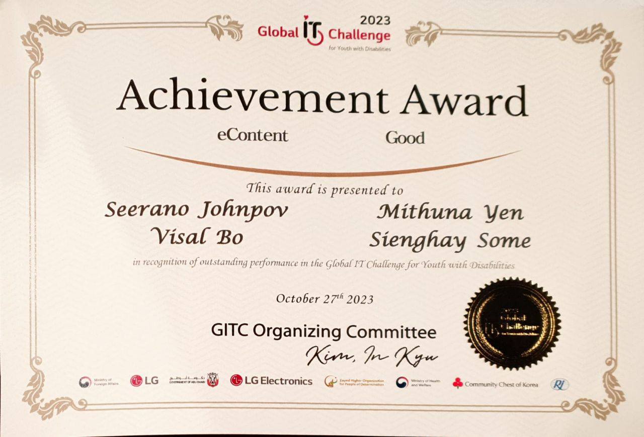 In addition to the individual gold, Cambodian Youth with Disabilities also collectively earned four bronze medals in the eContent category at the Global IT Challenge for Youth with Disability 2023. This impressive accomplishment came as a team effort by four participants.