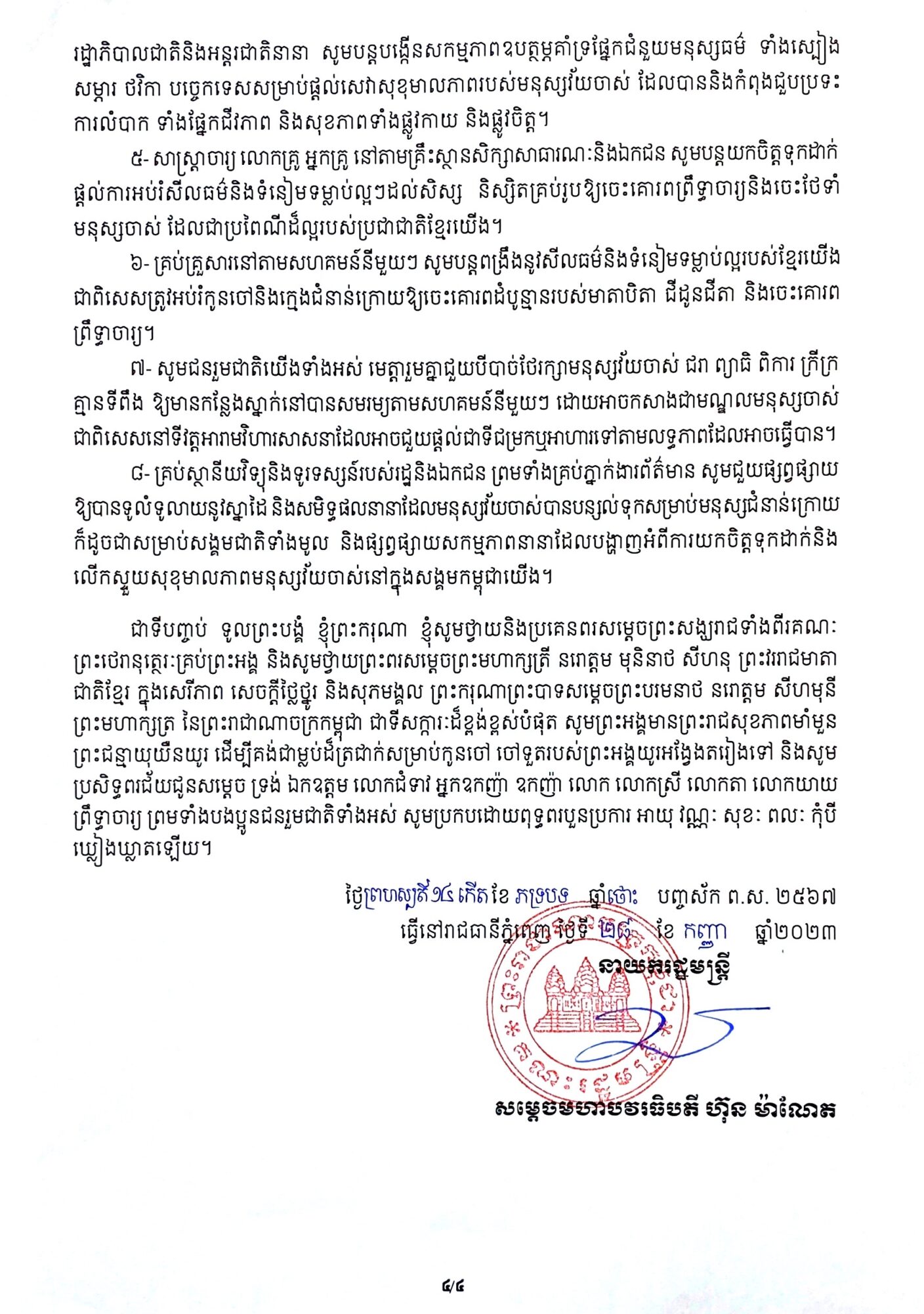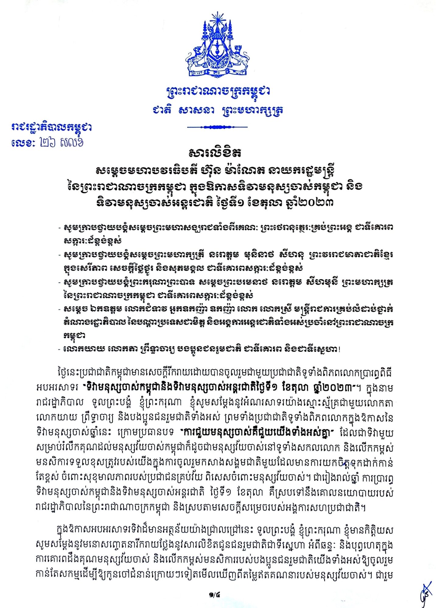 In a message commemorating the International Day for Older Persons on October 1, 2023 (signed on September 28), Samdech Hun Manet emphasized the significance of respecting and honoring the traditions, cultural heritage, and achievements passed down by previous generations. These generations included monarchs, citizens, public servants, soldiers, clergy, scholars, linguists, economists, researchers, artists, lawmakers, and scientists.