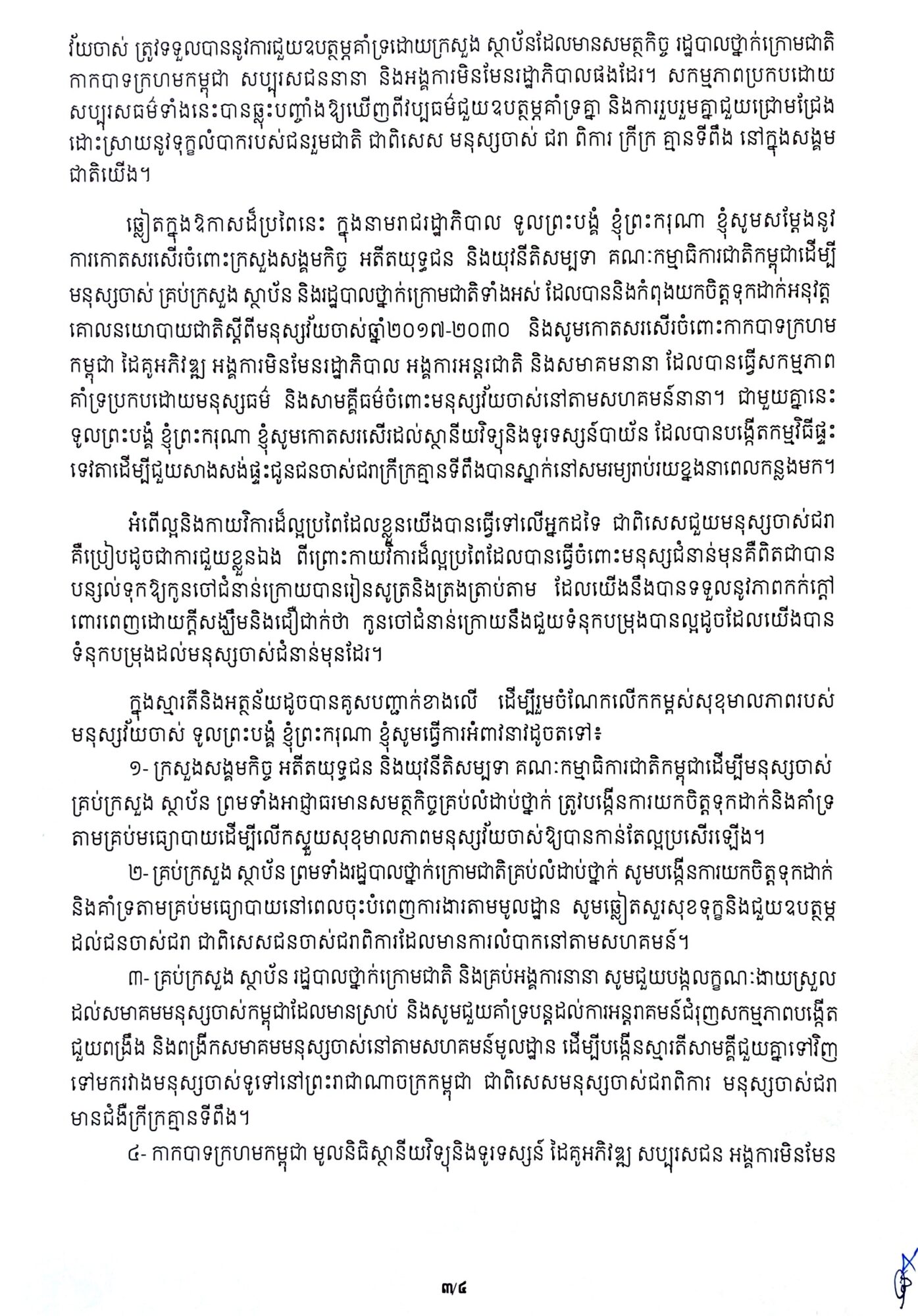Samdech Hun Manet also called for increased attention to the elderly, the disabled, the impoverished, and the homeless. He urged the provision of shelters, especially in pagodas and temples, offering shelter and sustenance to the elderly to the best extent possible. Additionally, he encouraged all public and private television stations and news agencies to share the stories and accomplishments of the elderly, inspiring the younger generation to show care and support for the well-being of Cambodia’s elderly citizens.