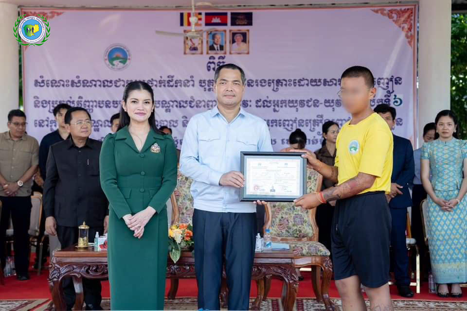 បាត់ដំបង៖ ឯកឧត្តម ជា សុមេធី រដ្ឋមន្ត្រីក្រសួងសង្គមកិច្ច អតីតយុទ្ធជន និងយុវនីតិសម្បទា និងលោកជំទាវ ជា ផល្គុន រសៀលថ្ងៃទី១៥ ខែកញ្ញា ឆ្នាំ២០២៤ បានដឹកនាំគណៈប្រតិភូ អញ្ជើញធ្វើទស្សនកិច្ចនៅមជ្ឈមណ្ឌលព្យាបាល និងស្តារនីតិសម្បទាអ្នកញៀនគ្រឿងញៀន កែ ស៊ីនួន ស្ថិតនៅភូមិស្តៅ ឃុំស្តៅ ស្រុករតនៈមណ្ឌល ខេត្តបាត់ដំបង និងបានប្រគល់វិញ្ញាបនបត្រ បណ្តុះបណ្តាលជំនាញវិជ្ជាជីវៈដល់ យុវជន យុវនារី ដែលបានបញ្ចប់វគ្គសិក្សាចំនួន ៩១នាក់ ព្រមទាំងបានផ្តល់ប័ណ្ណសរសើរដល់លោកគ្រូ អ្នកគ្រូ បុគ្គលិកបម្រើការងារក្នុងមជ្ឈមណ្ឌលនេះ សរុបចំនួន ៤៩នាក់ផងដែរ។