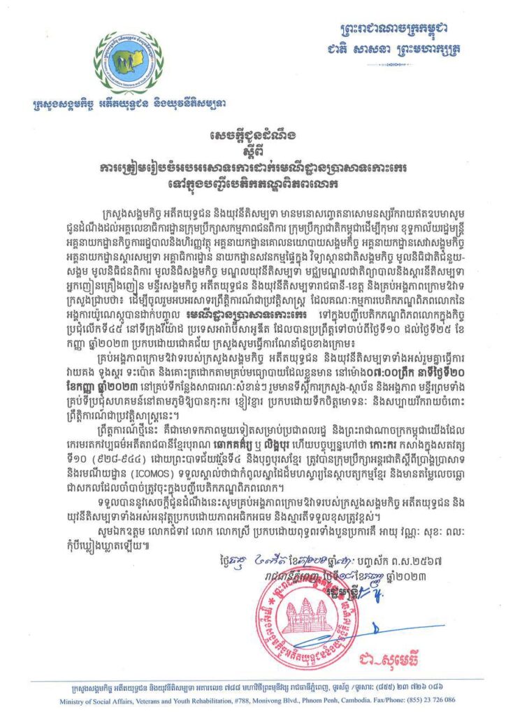 ក្រសួងសង្គមកិច្ច អតីតយុទ្ធជន និងយុវនីតិសម្បទា ចេញសេចក្តីជូនដំណឹងដល់អង្គភាព-ស្ថាប័ន និងមន្ទីរក្រោមឱវាទត្រៀមរៀបចំពិធីអបអរសាទរជាប្រវត្តិសាស្ត្រនៃការដាក់រមណីដ្ឋានប្រាសាទកោះកេរទៅក្នុងបញ្ជីបេតិកភណ្ឌពិភពលោក រួមគ្នាធ្វើការវាយគង ទូងស្គរ ទះប៉ោត និងគោះត្រដោកតាមគ្រប់មធ្យោបាយដែលខ្លួនមាននៅម៉ោង០៧:០០ព្រឹក នាទីថ្ងៃទី២០ ខែកញ្ញា ឆ្នាំ២០២៣។