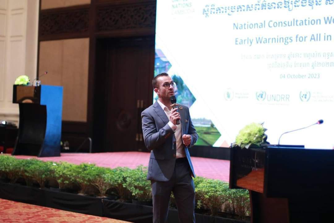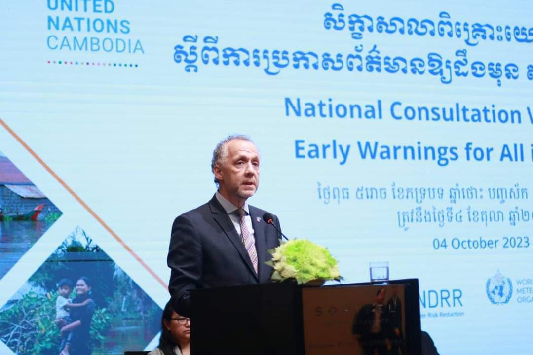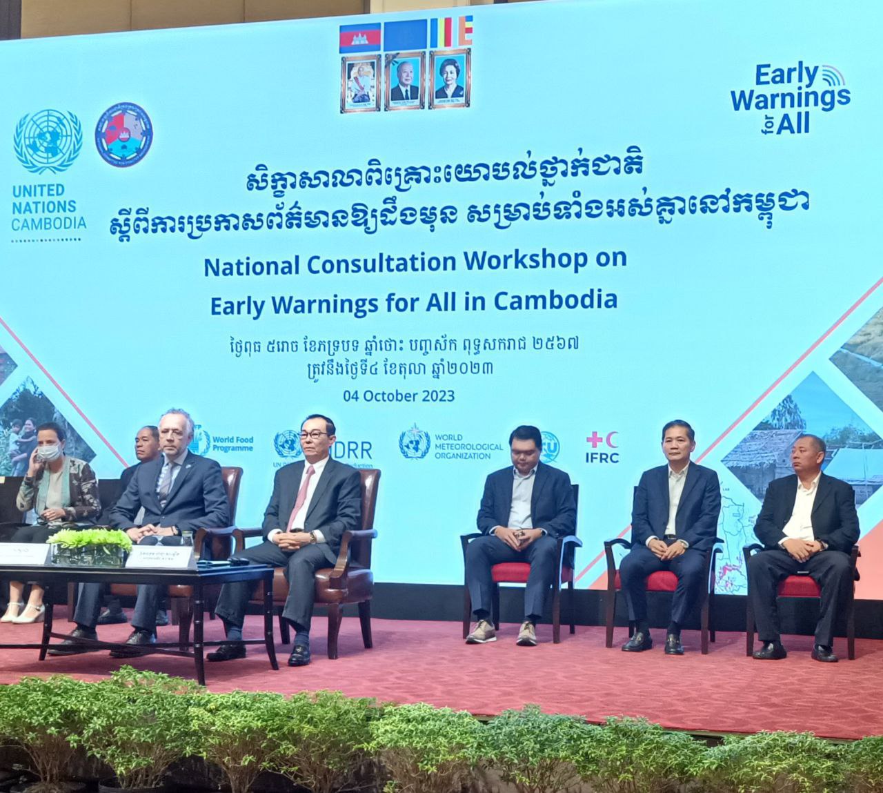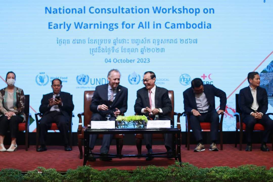 ភ្នំពេញ៖ ព្រឹកថ្ងៃពុធ ទី៤ ខែតុលា ឆ្នាំ២០២៣ រដ្ឋលេខាធិការក្រសួងសង្គមកិច្ច អតីតយុទ្ធជន និងយុវនីតិសម្បទា ឯកឧត្តម សុខ ប៊ុនថា បានអញ្ជើញចូលរួមសិក្ខាសាលាពិគ្រោះយោបល់ថ្នាក់ជាតិស្តីពីការប្រកាសព័ត៌មានឱ្យដឹងមុនសម្រាប់ទាំងអស់គ្នានៅកម្ពុជា(National consultation Workshop on Early Warning for All in Cambodia) រៀបចំឡើងដើម្បីរួមគ្នាកំណត់បញ្ហាប្រឈមសំខាន់ៗ និងផ្នែកបច្ចេកទេសជាអាទិភាពរយៈពេលវែងសម្រាប់ជម្រុញ EWS នៅកម្ពុជា ដែលនឹងរួមចំណែកដល់ការអភិវឌ្ឍផែនទីបង្ហាញផ្លូវក្នុងការអនុវត្តការងារសម្រាប់ឆ្នាំ២០២៤-២០២៧។